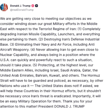Trump’s message echoed his earlier remarks that the U.S. is “getting very close” to meeting its objectives, raising the possibility that military operations could soon be scaled back.