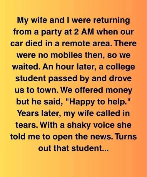 Our vehicle broke down on a lonely stretch of road, far from any assistance, and the clock ticked past 2 a.m. Just when hope seemed to vanish, a stranger appeared—a college student passing by who offered us a ride that would later prove to be a crucial moment in our lives.