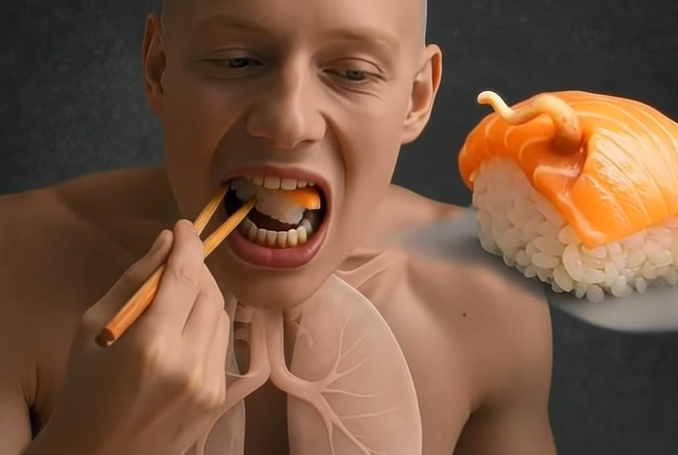 Many people think sushi is always clean and safe… but raw seafood can carry parasites such as Anisakis (a parasite that can invade the stomach lining).